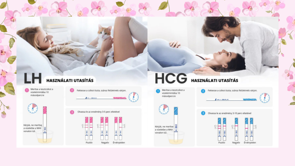 A csomag LH ovulációs és hCG terhességi tesztcsíkokat tartalmaz. Az LH teszt az ovuláció közeledtét, a hCG teszt pedig a terhesség korai szakaszát mutatja ki.