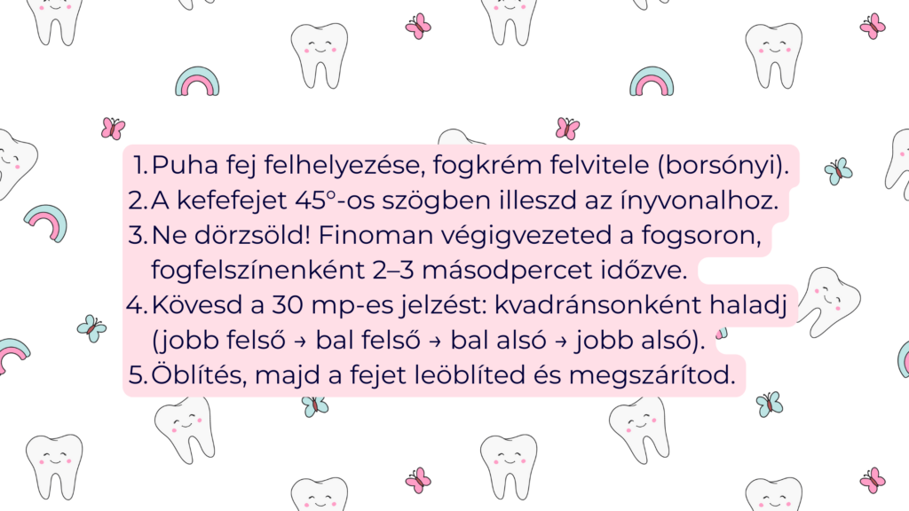 Megjegyzés gyerekeknek: a helyes fogmosó mozdulatokat először hagyományos kefével érdemes megtanítani, és csak utána jöjjön a szónikus.
